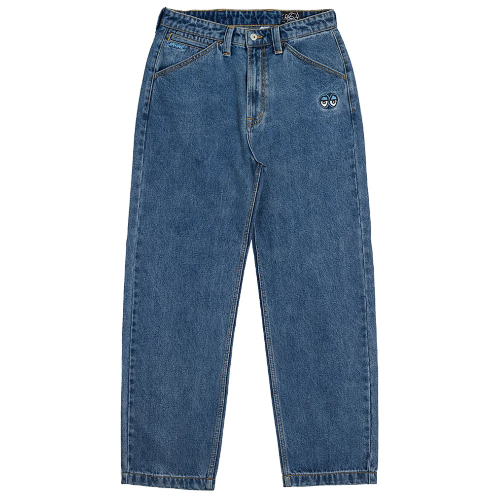 Denim pants with a loose fit and custom krooked branding on front left and right front pocket.